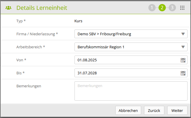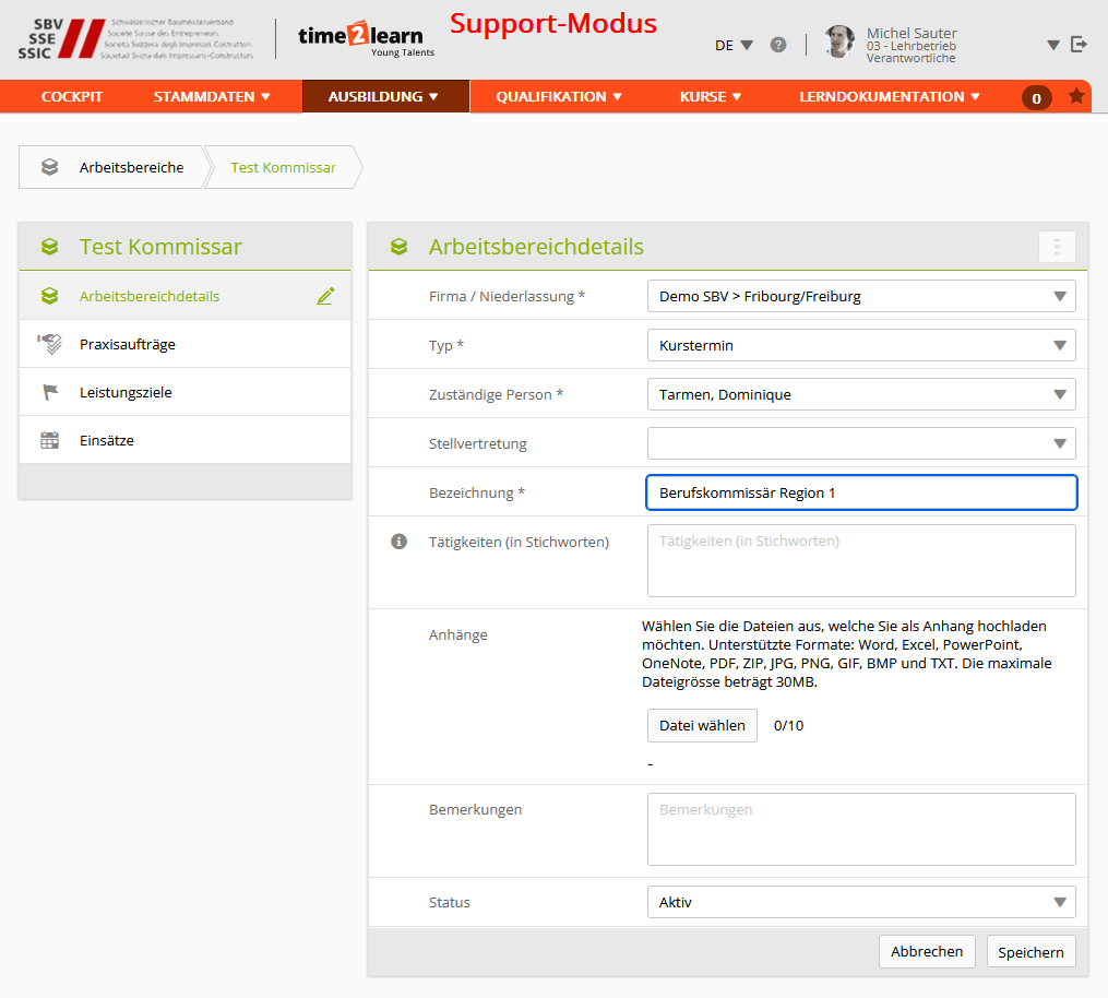 Unter "Ausbildung" - "Arbeitsbereiche" wird ein neuer Arbeitsbereich vom Typ "Kurstermin" erstellt und der Benutzer als verantwortliche Person gesetzt.