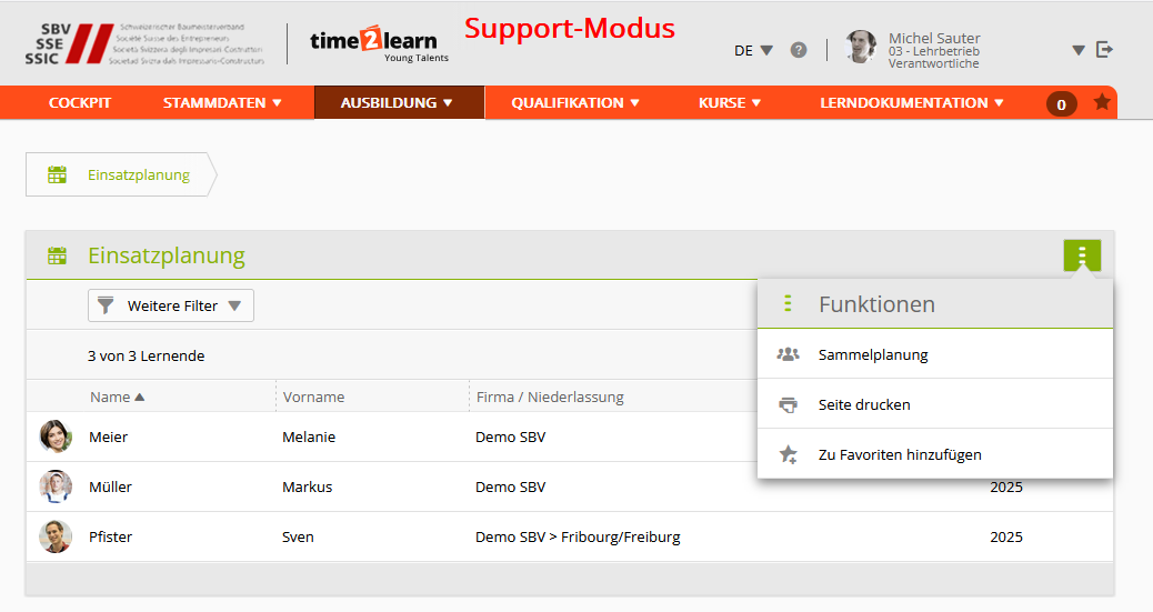 Durch die Einsätze werden die Lernenden den neuen Benutzer zugeteilt. Mit der Sammelplanung kann dies gleichzeitig für mehrere Lernende gemacht werden.