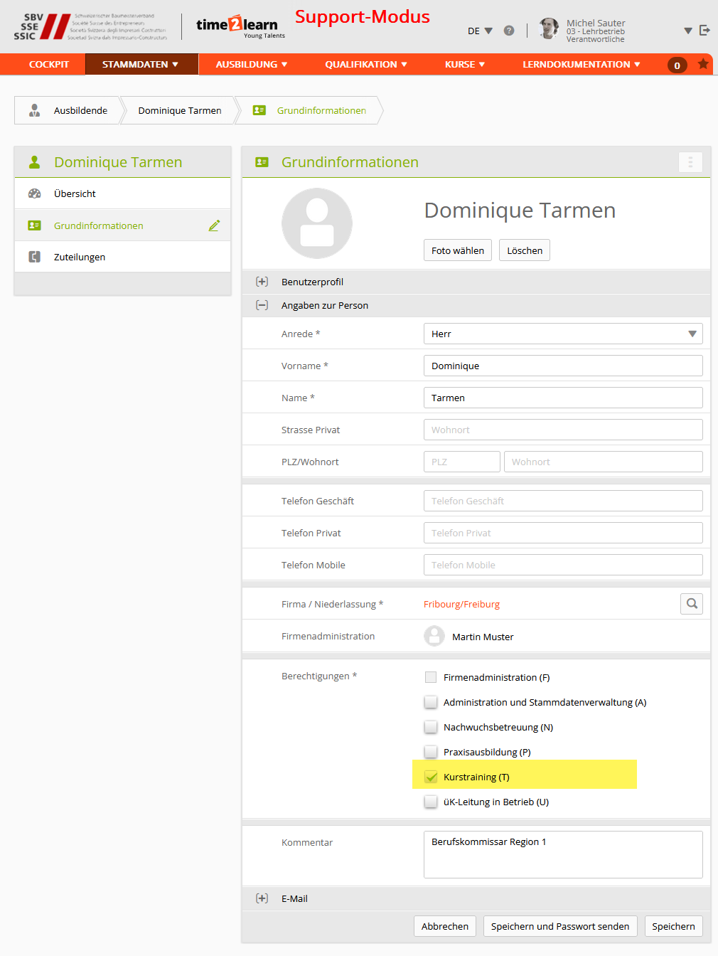 Erfasse den Benutzer unter "Stammdaten" "Ausbildende" und setze die Berechtigung "Kurstraining (T)"
