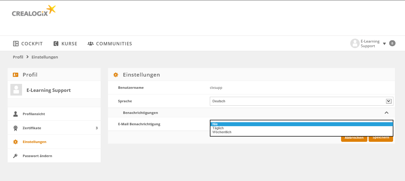 Der Benutzer kann in seinen Profileinstellungen die Häufigkeit dieser-Mail Benachrichtigung einstellen auf Nie, Täglich oder Wöchentlich (Diese Funktion steuert nur den Versand der Sammel-Mails für Social Learning Aktivitäten, nicht für Kursaktivitäten)