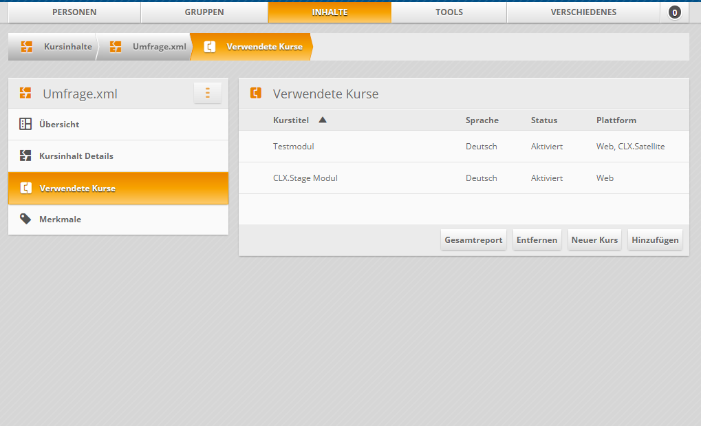 Im Administrationsbereich, unter Kurse > Kursinhalte > nach der gewünschten Umfrage suchen. Im Abschnitt Verwendete Kurse kann über den Button Gesamtreport der Umfragereport generiert und heruntergeladen werden.