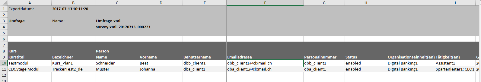 Im Report werden die Daten aller ausgefüllten Umfragen über alle Kurse, die mit der Umfrage verknüpft sind, dargestellt. Unausgefüllte Umfragen werden nicht berücksichtigt.