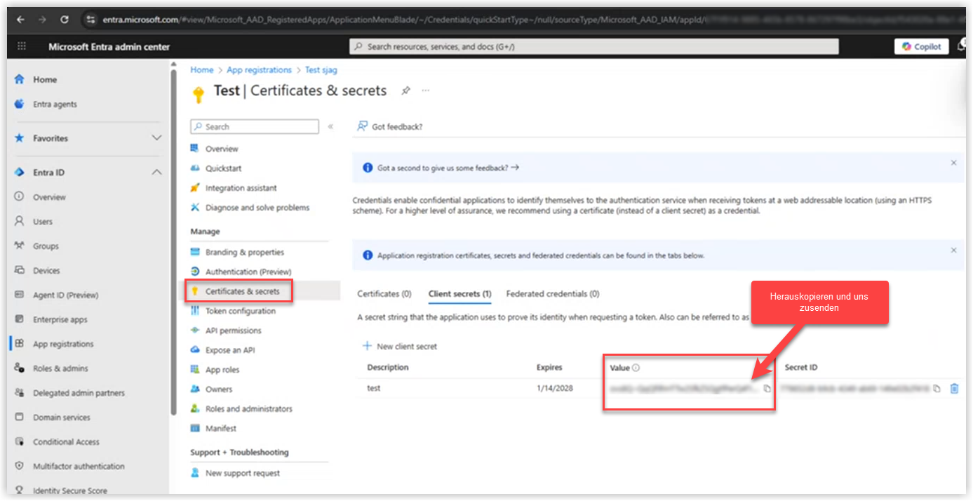 - Im Menü unter Certificates & secrets auf New client secret klicken