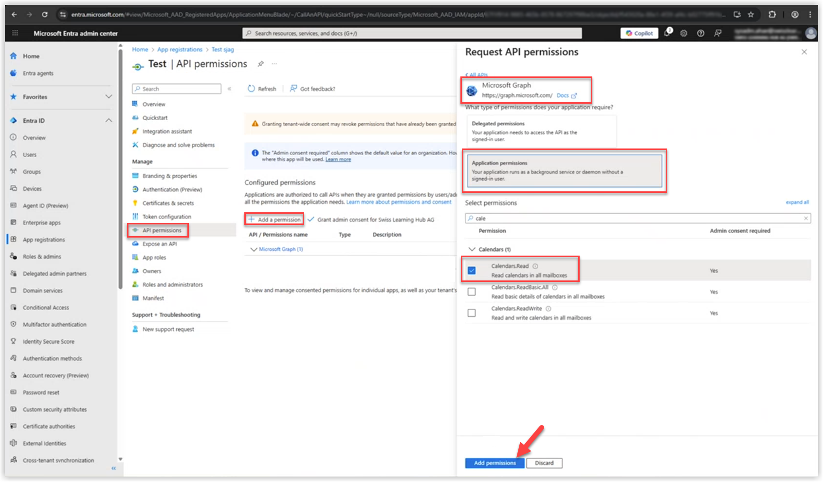 - Unter Application permissions -> Calendars die Option Calendars.Read aktivieren und auf "Add permissions" klicken