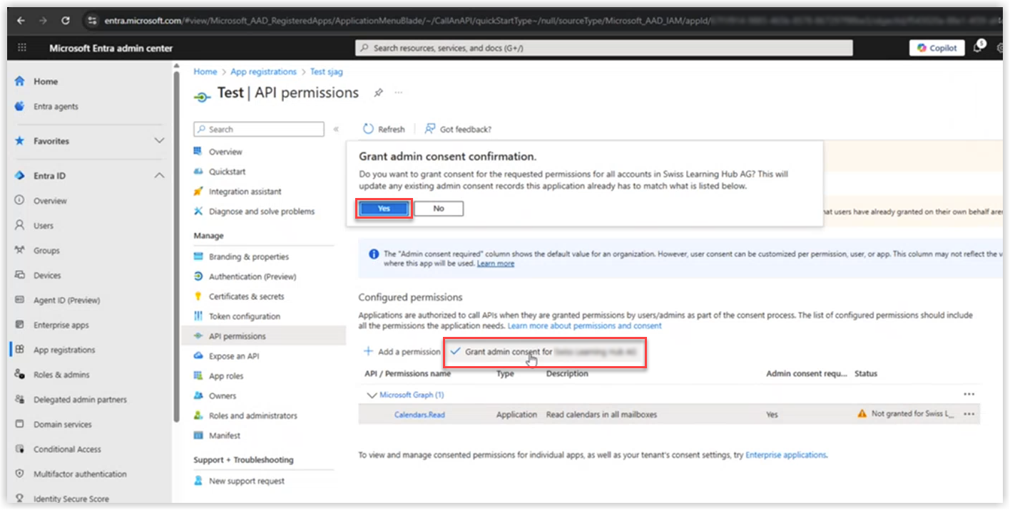 - Anschliessend noch auf "Grant admin consent for [company]" klicken und bestätigen, damit alle User der Firma diese Berechtigung erhalten.