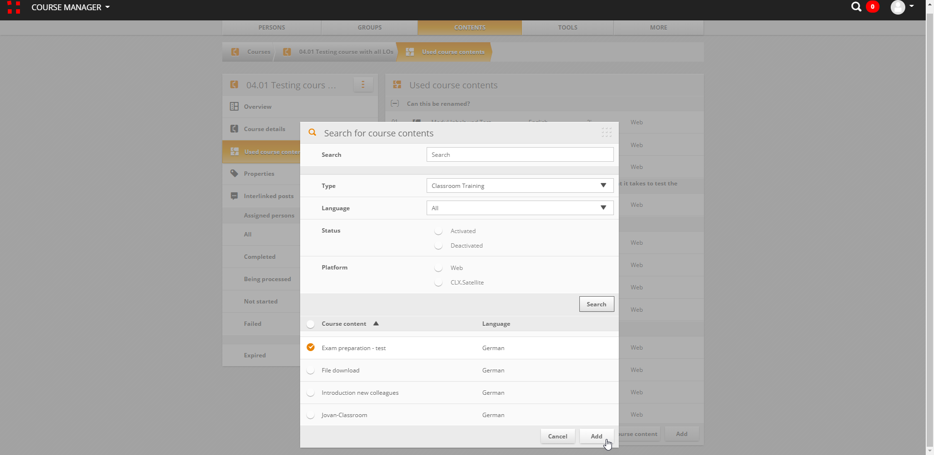 - Gehen Sie auf den Tab Verwendete Kursinhalte -> klicken Sie auf Hinzufügen und suchen Sie das entsprechende Präsenzmodul -> fügen Sie es zum Kurs hinzu