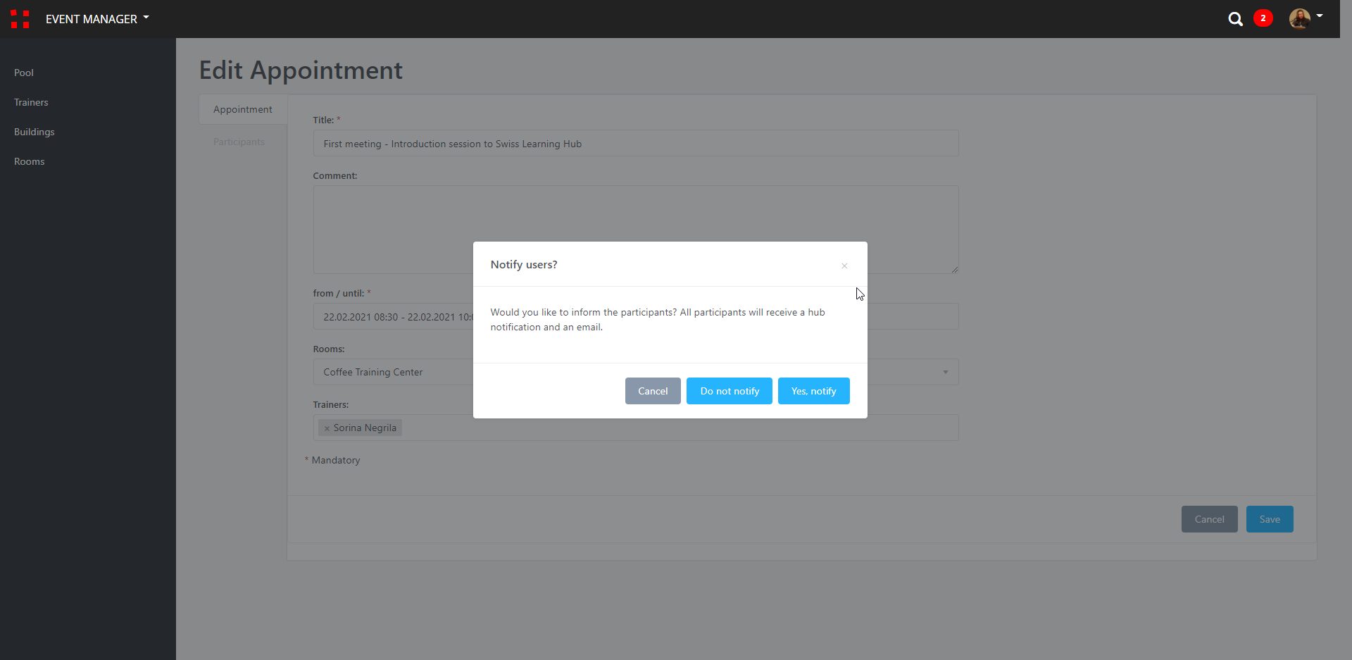 ->Administrator kann entscheiden, ob Benutzer benachrigit werden soll oder nicht - bei einer Orts-, Datums-/Zeit- oder Dozenten Änderung für einen Termin