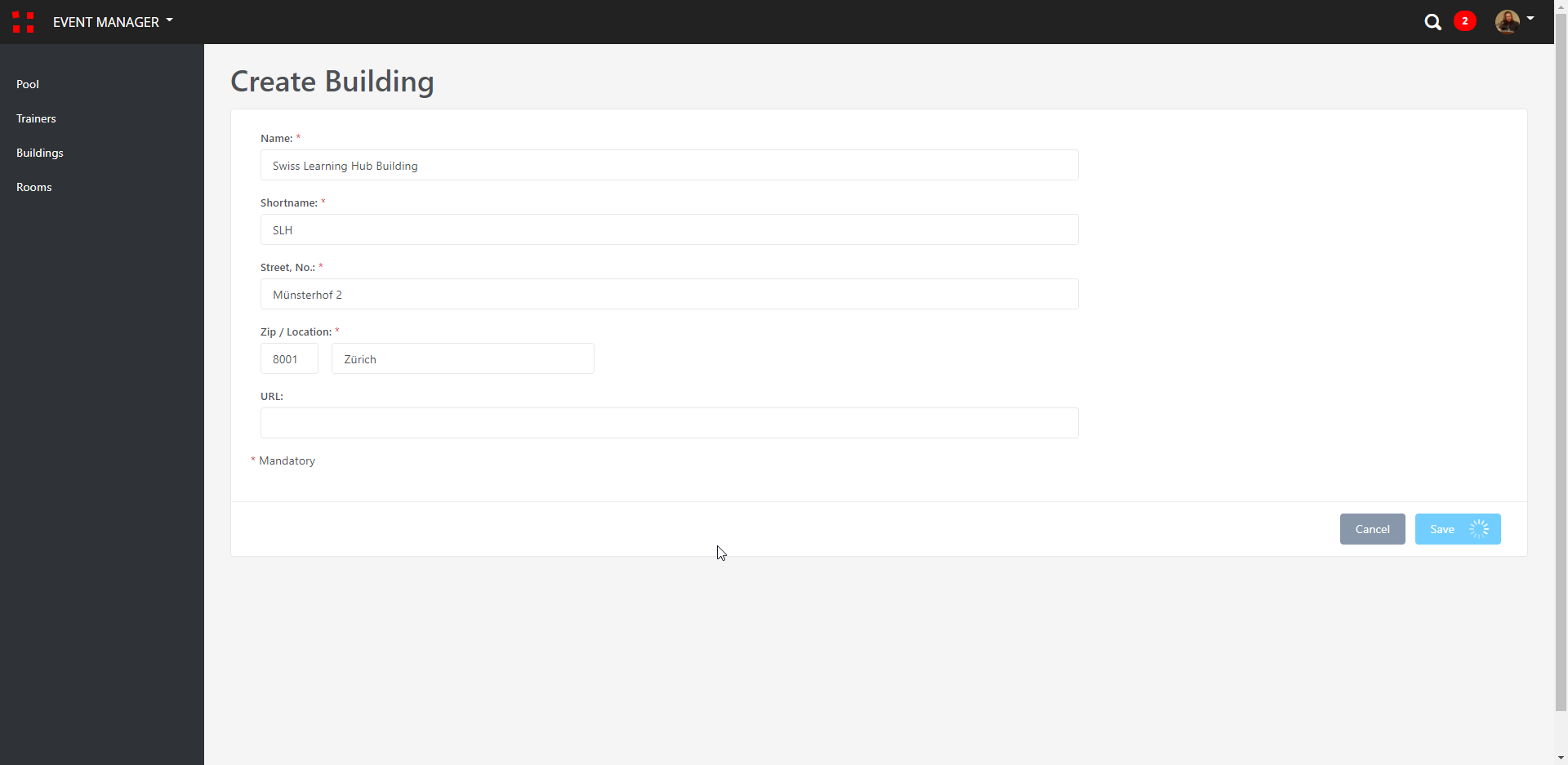 Gebäude enthalten nur einen Namen für das Gebäude, eine entsprechende Adresse und optional eine URL. Sofern der Gebäudeeintrag eine korrekte Adresse enthält, wird nach dem Speichern der entsprechende Google Maps Ausschnitt für den Administrator zur Überprüfung angezeigt.