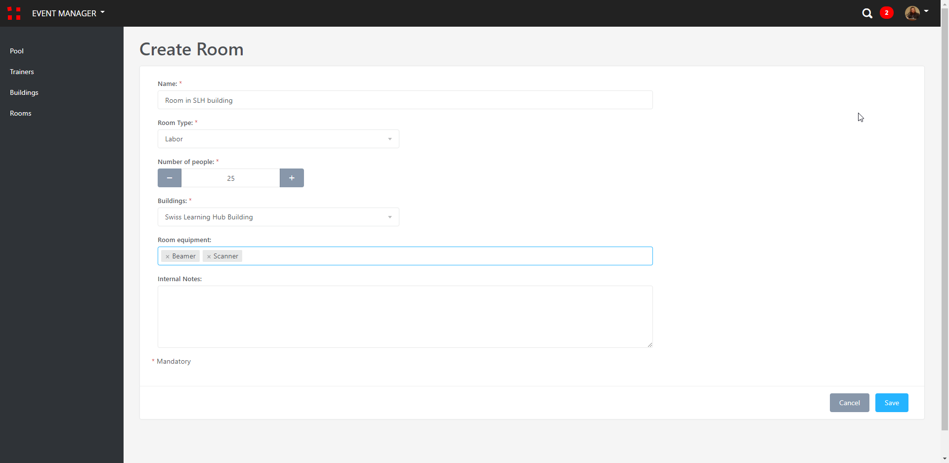 Räume müssen mit der maximalen Kapazität (wie viele Personen für eine Schulung darin Platz finden könnten) und optional mit Ressourcen vor Ort (Tafel, Beamer etc.) konfiguriert werden.