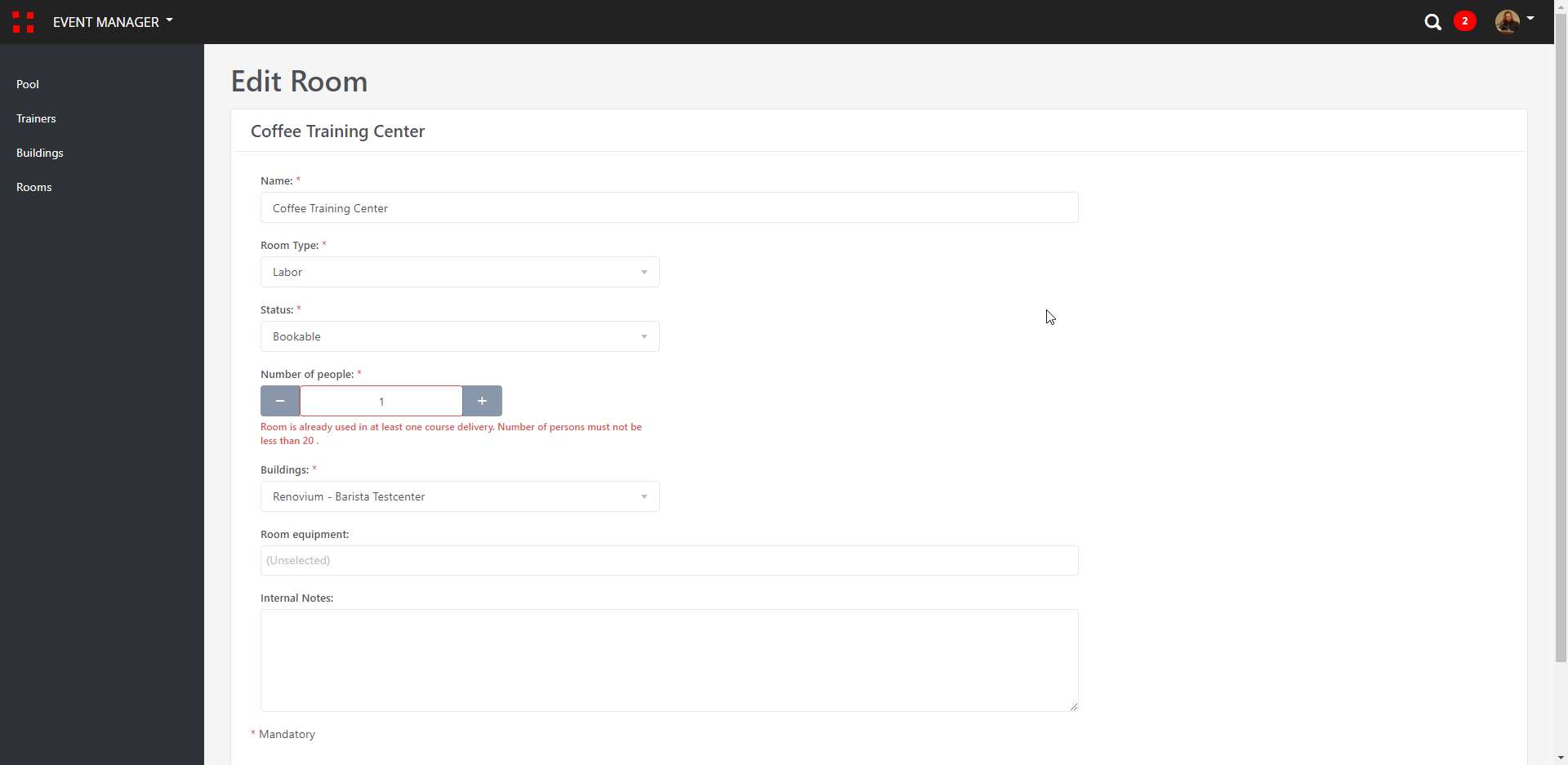 Wenn ein Raum mit einer Kapazität von 50 Personen bereits in einer aktiven Durchführung verwendet wird, können Sie den Raum nicht bearbeiten und die Kapazität/Personenzahl verringern. Unten sehen Sie die Fehlermeldung in einer solchen Situation: