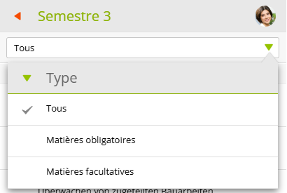 Tu peux filtrer les matières de chaque semestre ci-dessus en fonction des matières facultatives et obligatoires.