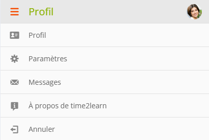 En cliquant sur ton profil en haut à droite, tu peux modifier tes paramètres, consulter les messages reçus ou cliquer sur « À propos de time2learn » si tu as des questions ou des problèmes.