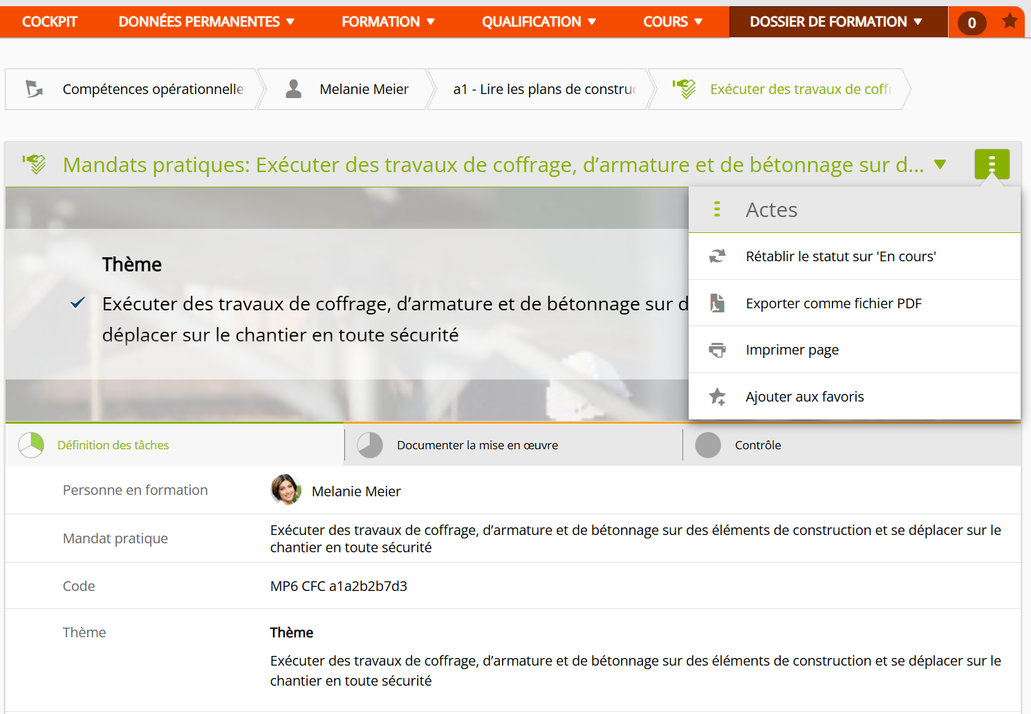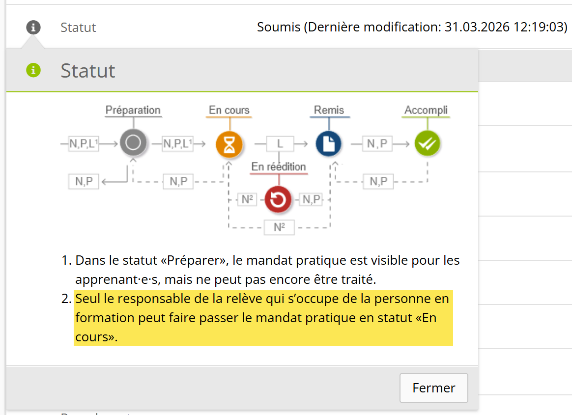 | Les mandats pratiques terminés ou déjà remis ne peuvent pas être supprimés directement. Il faut plutôt les ramener progressivement à un statut antérieur. Cette tâche ne peut être effectuée que par le formateur ou la formatrice responsable. | |