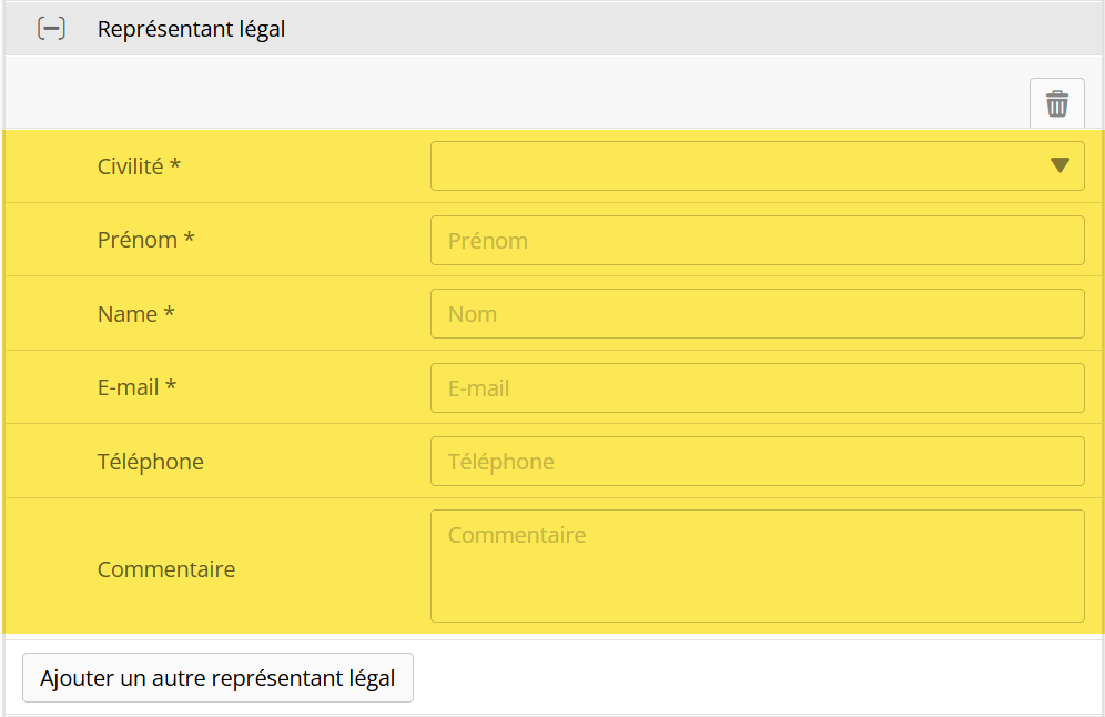 | Ouvrez le mode d'édition sous Personnes en formation→ Données de base et ajoutez une nouvelle personne dans la section Représentant légal (titre, e-mail, prénom/nom sont des champs obligatoires). Il est possible d'ajouter jusqu'à 3 représentant(e)s légaux par apprenti(e). |