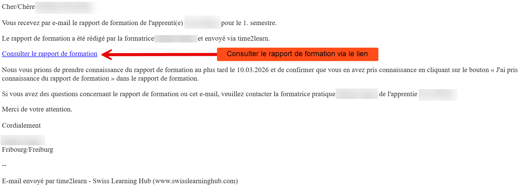 | Les personnes invitées reçoivent un e-mail unique contenant un lien vers le rapport de formation. En cliquant sur Consulter le rapport de formation, elles ouvrent le rapport et peuvent confirmer la consultation à la fin. |