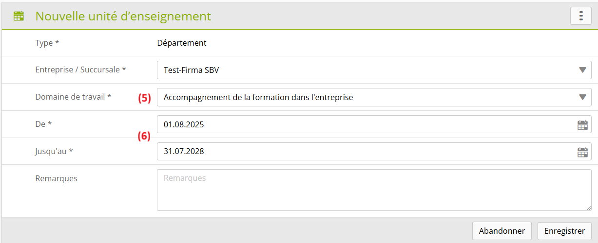 3. Sous Formation > Planification des interventions, créer une affectation pour le domaine de travail « Accompagnement de la formation dans l'entreprise » à l'aide de la planification collective pour tous les nouveaux apprentis (5)
