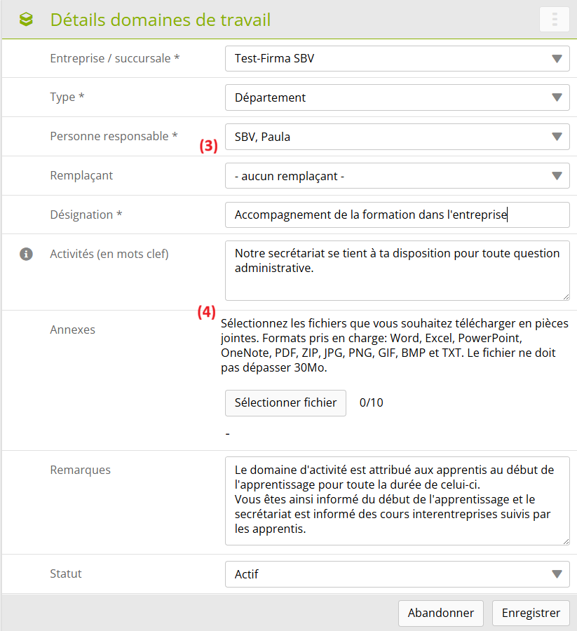 2. Sous Formation > Domaines de travail, créer un domaine de travail « Accompagnement de la formation dans l'entreprise » avec « Secrétariat » comme personne responsable (3).