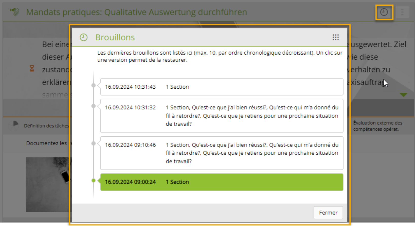 Ces brouillons sont présentés de manière claire et chronologique aux personnes en formation, qui peuvent les restaurer en cliquant sur la version.