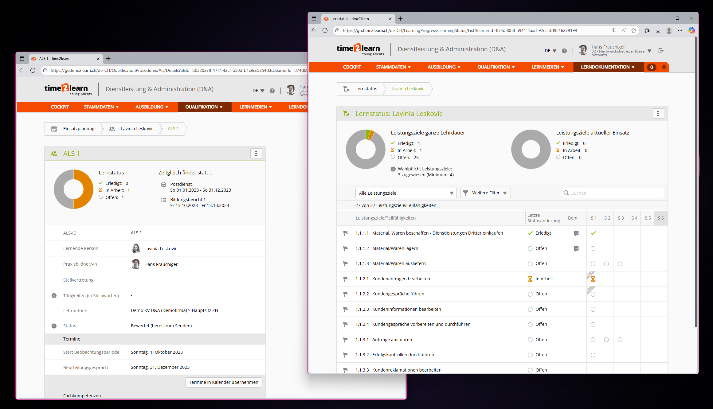 Dans time2learn, vous pouvez travailler en parallèle, par exemple pour visualiser la planification des interventions d’un apprenti et vérifier en même temps son statut d’apprentissage.
