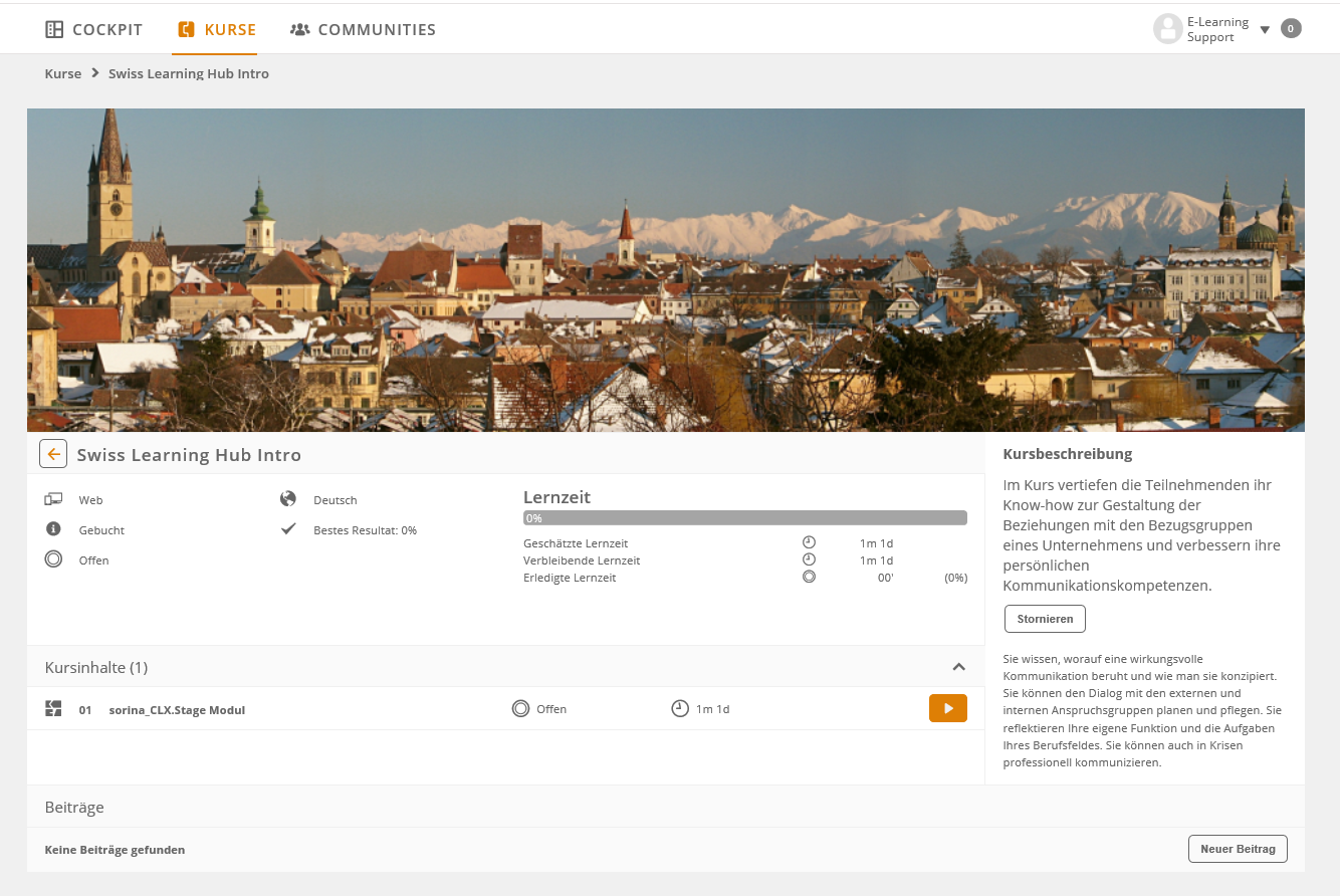 Sobald der Kurs gebucht wurde, können sich die Lernenden jederzeit über den Button „Stornieren“ wieder vom Kurs abmelden.