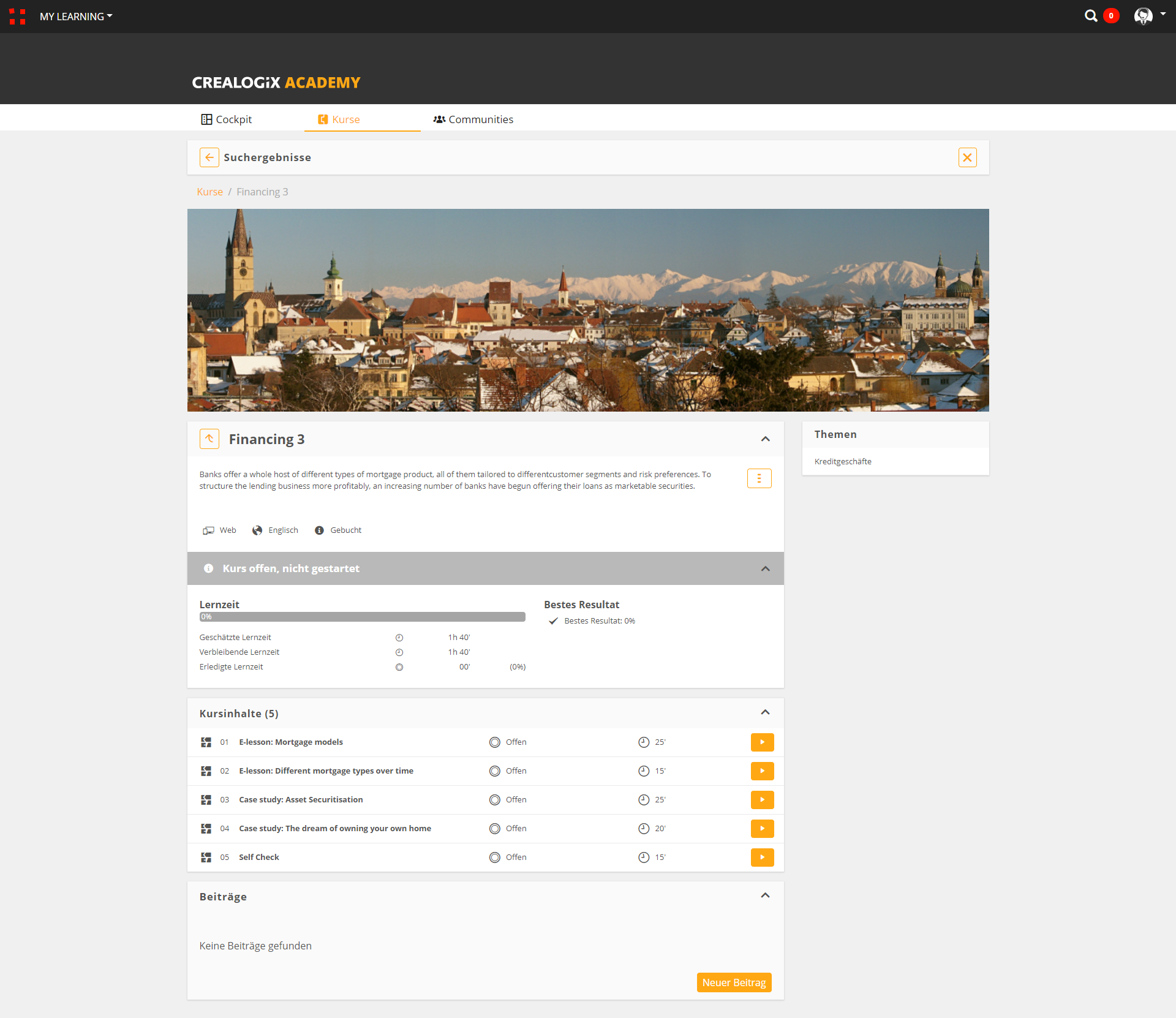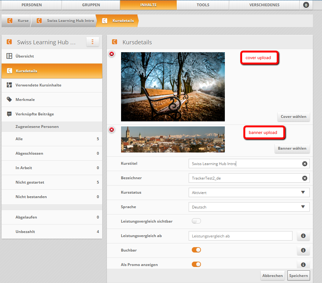 Das Kurs Cover Bild erscheint im Cockpit und in der Mediathek. Klicken Sie dazu im Administrationsbereich einfach auf Kursdetails > Bearbeiten > Cover wählen und laden Sie ein .png oder .jpg hoch (für beste Resultate empfehlen wir folgende Dimensionen: 330x220).