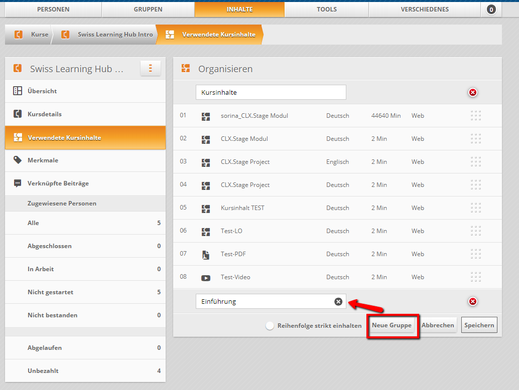 Im Administrationsbereich können Sie auf der Detailseite des Kurses im Administrationsbereich in den Bereich Verwendete Kursinhalte wechseln, dann auf die Dropdown-Liste Aktionen klicken und Organisieren wählen. Klicken Sie auf die Schaltfläche Neue Gruppe und geben Sie den Namen der ersten Inhaltsgruppierung ein (z.B. Einführung).