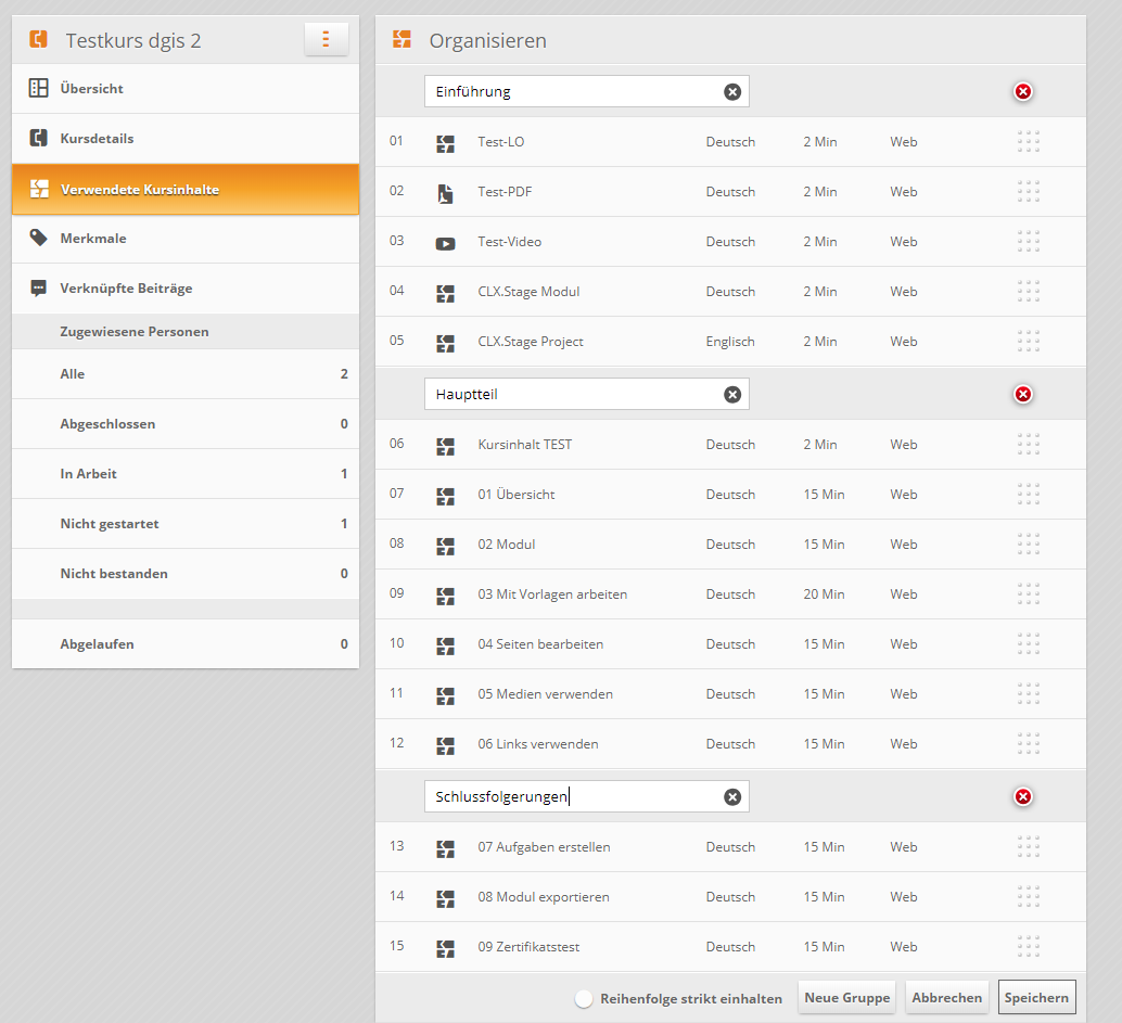 Per Drag & Drop können Sie diesen Gruppierungs-Header an eine beliebige Stelle unter den Lernobjekten verschieben: alle darunter liegenden Inhalte werden nun Teil dieser Gruppierung. Sie können den Vorgang für beliebig viele Gruppierungen wiederholen & Speichern, damit Ihre Kursseite in etwa so aussieht: