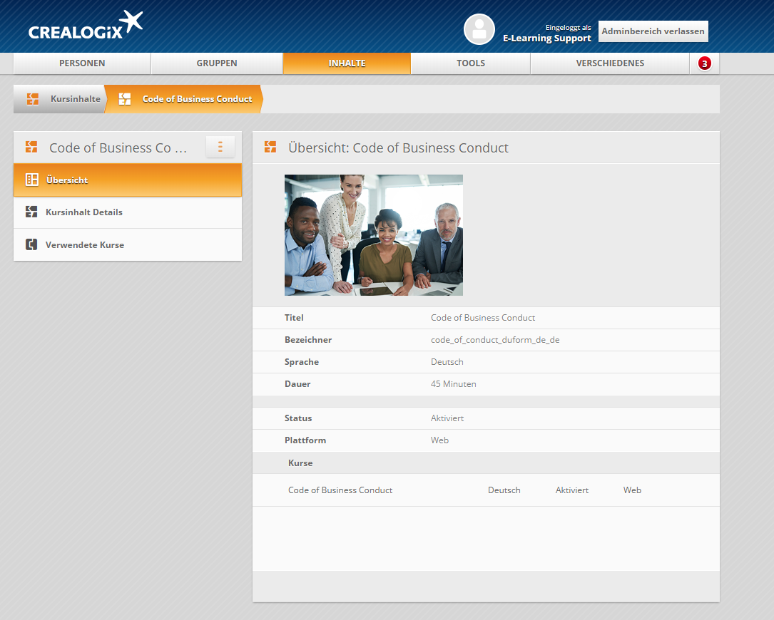 Sobald Sie einen Kursinhalt hochgeladen haben, können Sie dessen Details bearbeiten. In der Übersicht sind die wichtigsten Informationen zusammengezogen. Ebenfalls ist erkennbar, in welchem Kurs der Kursinhalt verwendet wird.