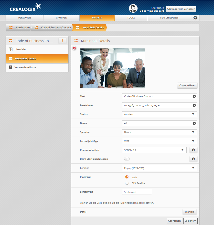 Upload eines Coverbildes: Laden Sie ein jpg oder png mit den empfohlenen Dimension von 330x220 hoch, das dann im Lernendenbereich auf der Lernobjekt-Detailansicht innerhalb eines Kurses angezeigt wird.