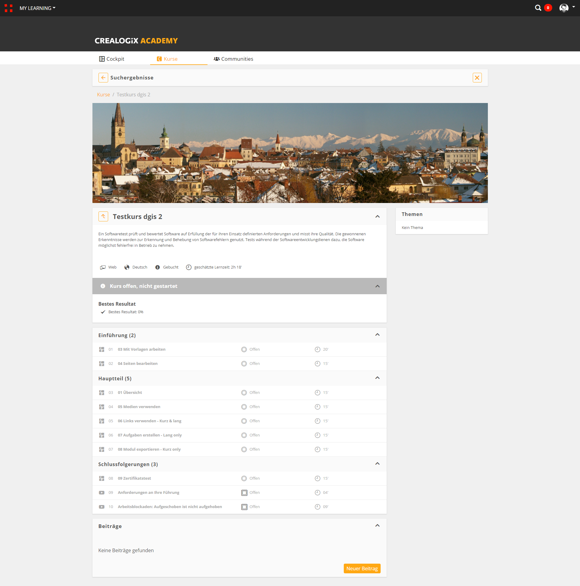 In der Detailansicht des Kurses von oben können Sie erkennen, dass die Lernobjekte ausgegraut und die Kursinhalt Run buttons ausgeblendet sind. Der Kurs kann vom Lernenden nicht aktiv bearbeitet werden.