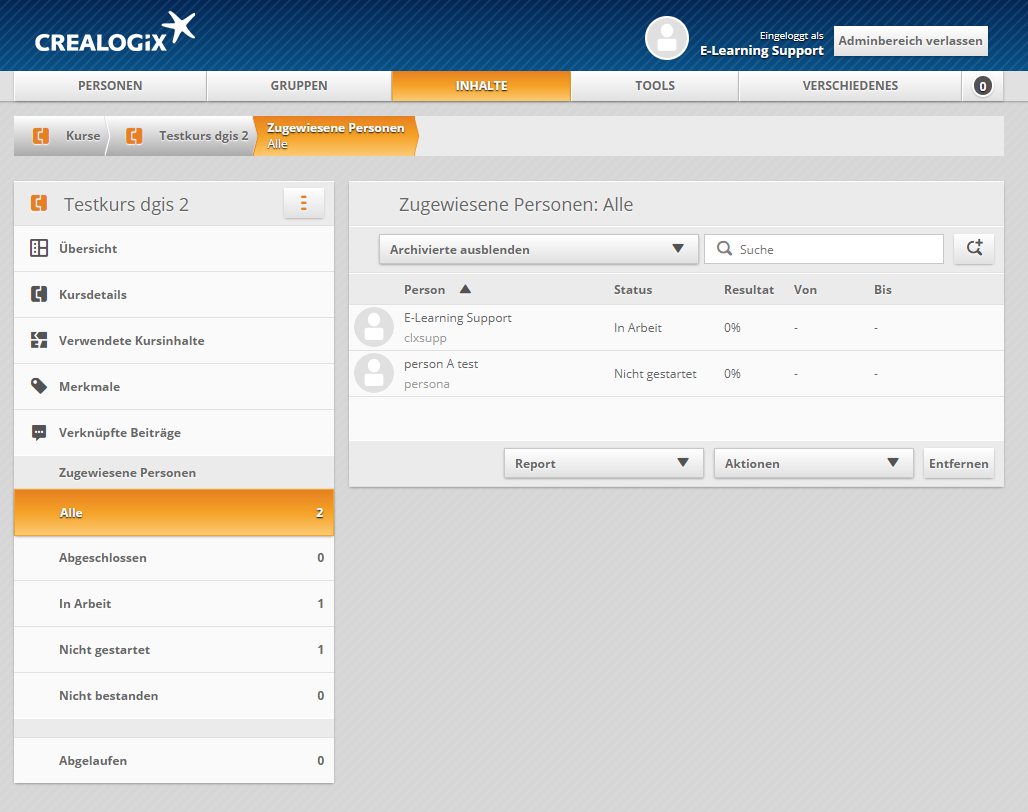 - aus der Personenansicht aber kann der Kurs weiterhin zugewiesen werden. Sollte dies passieren, so wird der Lernende den Kurs ersann sehen, wenn sein Status auf "aktiviert" gewechselt wird