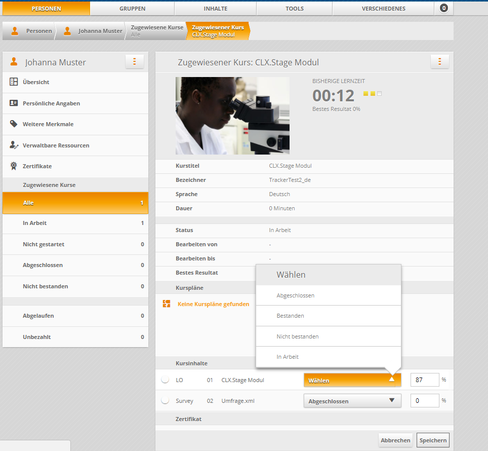 - im Status-Dropdown einen der verfügbaren Status auswählen: Abgeschlossen, Bestanden, Nicht bestanden, In Arbeit