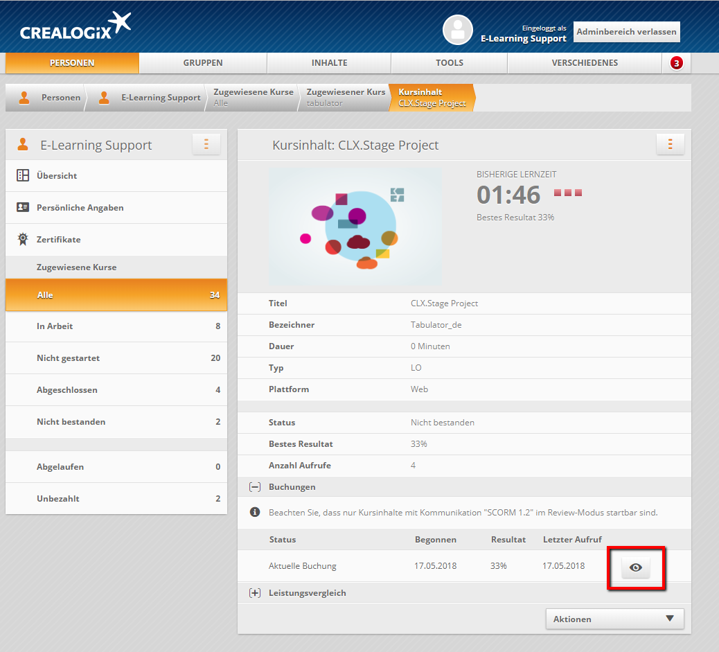 - Der Kursinhalt der Person öffnet sich im read-only Modus und Sie sehen den aktuellen Lernstand der Person