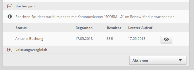 Der Testeinsichtmodus ermöglicht es Ihnen, Einblick in den Status und den Lernfortschritt eines SCORM 1.2 Kursinhalts für eine bestimmte Person zu erhalten, ohne die Lernfortschrittsinformationen zu ändern. Das bedeutet, dass Sie die Antworten des Lernenden oder die bereits besuchten Seiten sehen können, ohne dass Sie die Antworten oder Status innerhalb des Moduls ändern können ("read-only").