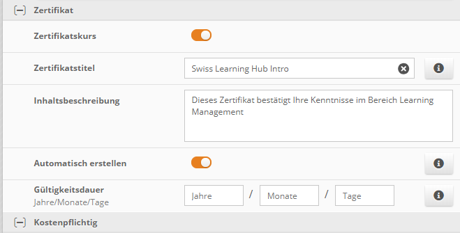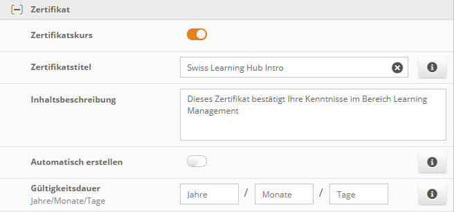 - das Zertifikat kann automatisch erstellt werden, wenn alle im Kurs enthaltenen & für den Status relevanten Inhalte vom Lernende abgeschlossen werden. Im Administrationsbereich > Kurse > Ihr Kurs > Kursdetails aktivieren Sie den toggle Zertifikatskurs", tragen Sie einen Zertifikatstitel und eine Beschreibung ein und aktivieren Sie den toggle "Automatisch erstellen".