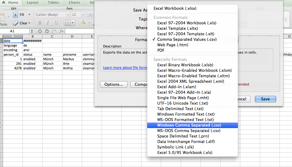 Speicherung von Listen unter OSX in Excel: "Windows Comma Separated" wählen.