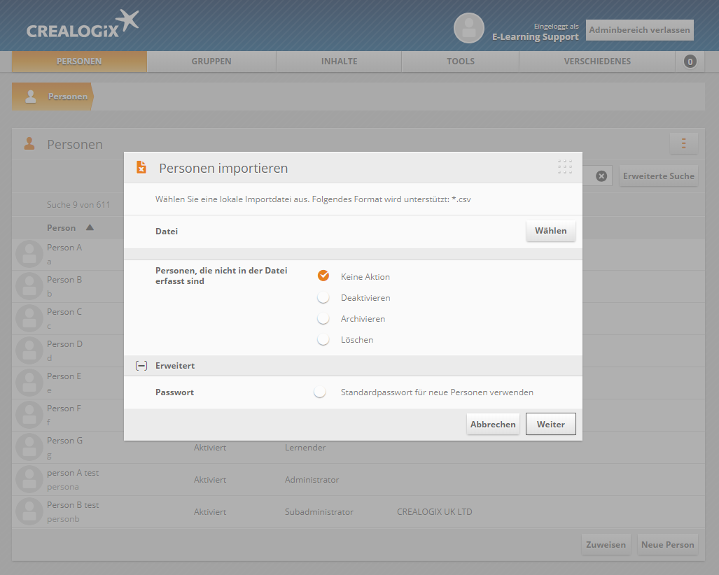 Anschliessend können Sie im Fenster "Personen importieren" über den Button Wählen die CSV-Datei mit den zu importierenden Usern auswählen.