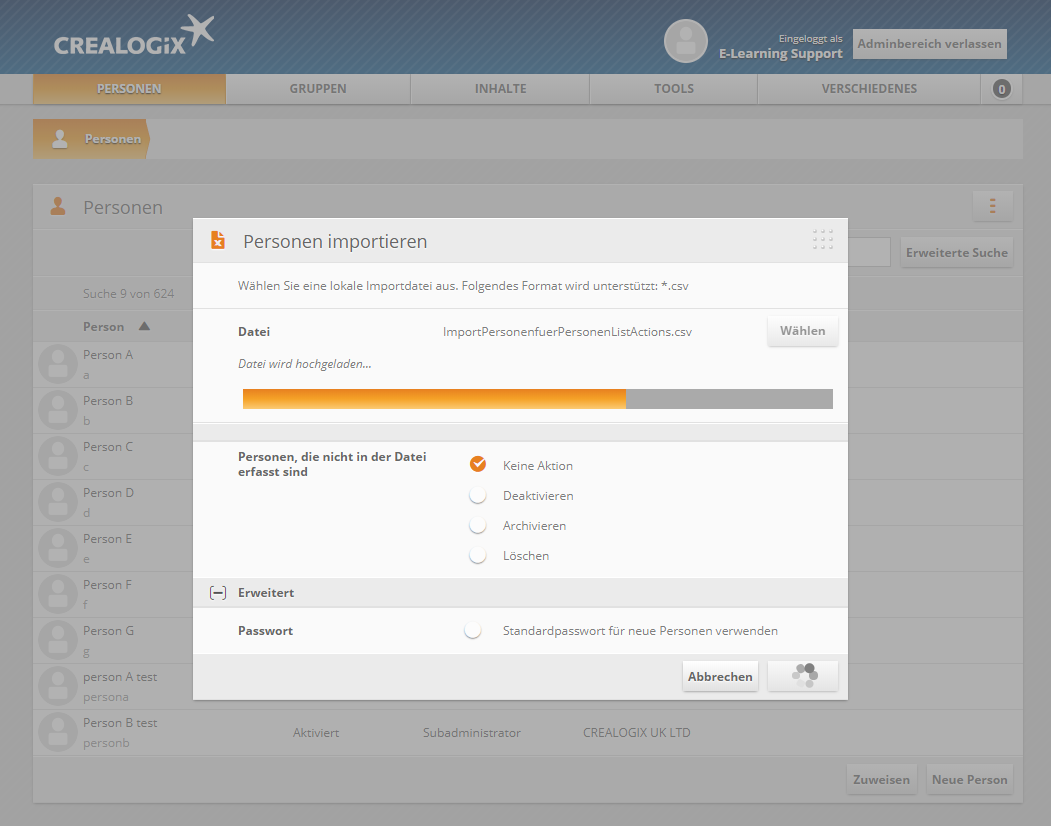 Die bereits erfassten User, die nicht in der Datei sind, werden beim Import je nach Einstellung deaktiviert, archiviert oder gelöscht.