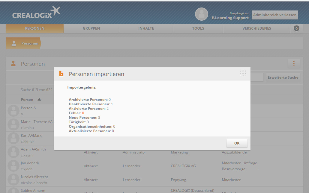 - Organisationseinheiten: Anzahl Organisations-einheiten, die durch den Import im System neu erstellt wurden.
