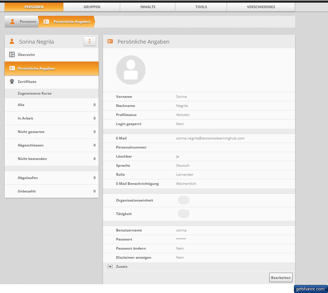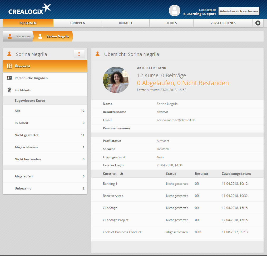 Wenn Sie eine Person aus der Personenverwaltung ausgewählt haben, können Sie sich im Bereich Übersicht einen schnellen Überblick über die wichtigsten Daten verschaffen. Darunter: die Anzahl der zugewiesenen Kurse, die Anzahl der veröffentlichten Beiträge, wann die letzte Aktivität stattgefunden hat, den Status und die eingestellte Sprache der Person: