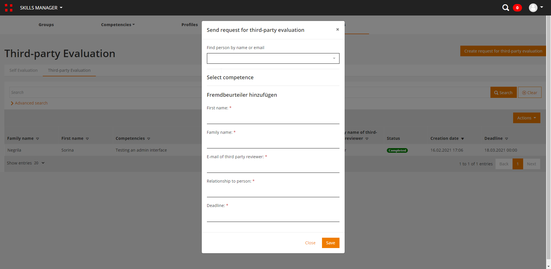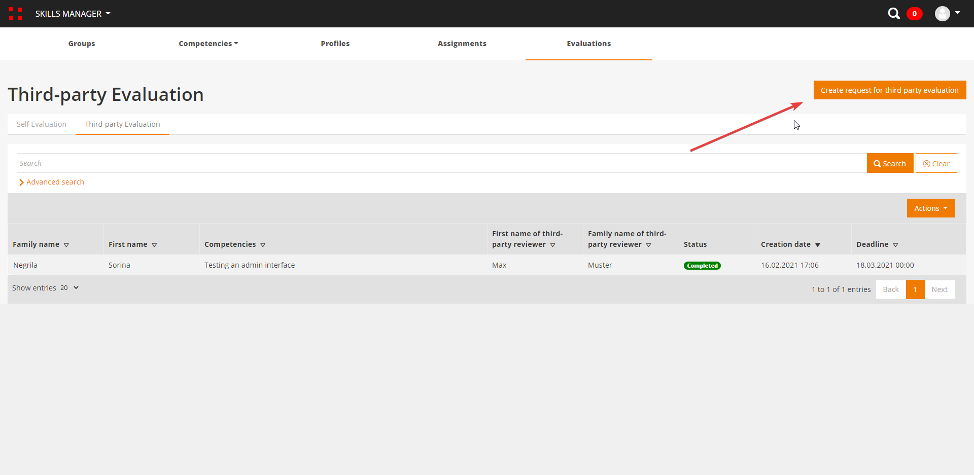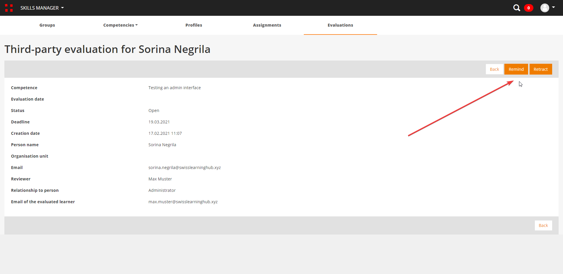Administratoren können Einladungen auch direkt über die Verwaltungsoberfläche versenden, indem sie im Skill Manager zum Bereich „Evaluationen“ navigieren.