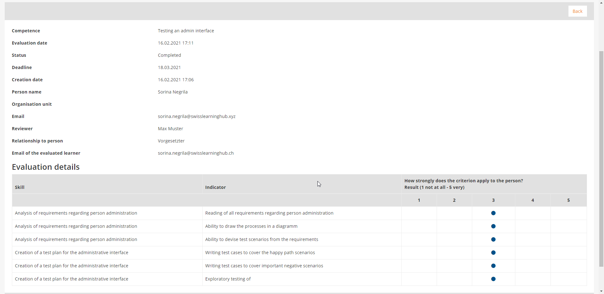 Ein wichtiger Hinweis zu den Selbst- und Fremdeinschätzungen: Vergessen Sie nicht, dass der Lernende die Möglichkeit hat, die Selbsteinschätzung für die Kompetenz mehrmals auszufüllen. Auch kann er Fremdbewertungen von mehreren Personen anfordern. In diesen Fällen wird der Durchschnitt der Noten pro Indikator in die Berechnungen einbezogen! Ansonsten unterscheidet sich die Logik nicht von den oben gezeigten Beispielen.