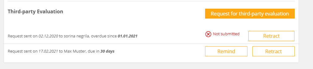 Falls der Status einer Bewertung kurz vor Ablauf der Frist weiterhin auf „offen“ steht, besteht zudem die Möglichkeit, Einladungen zurückzuziehen oder Erinnerungsemails zu versenden.