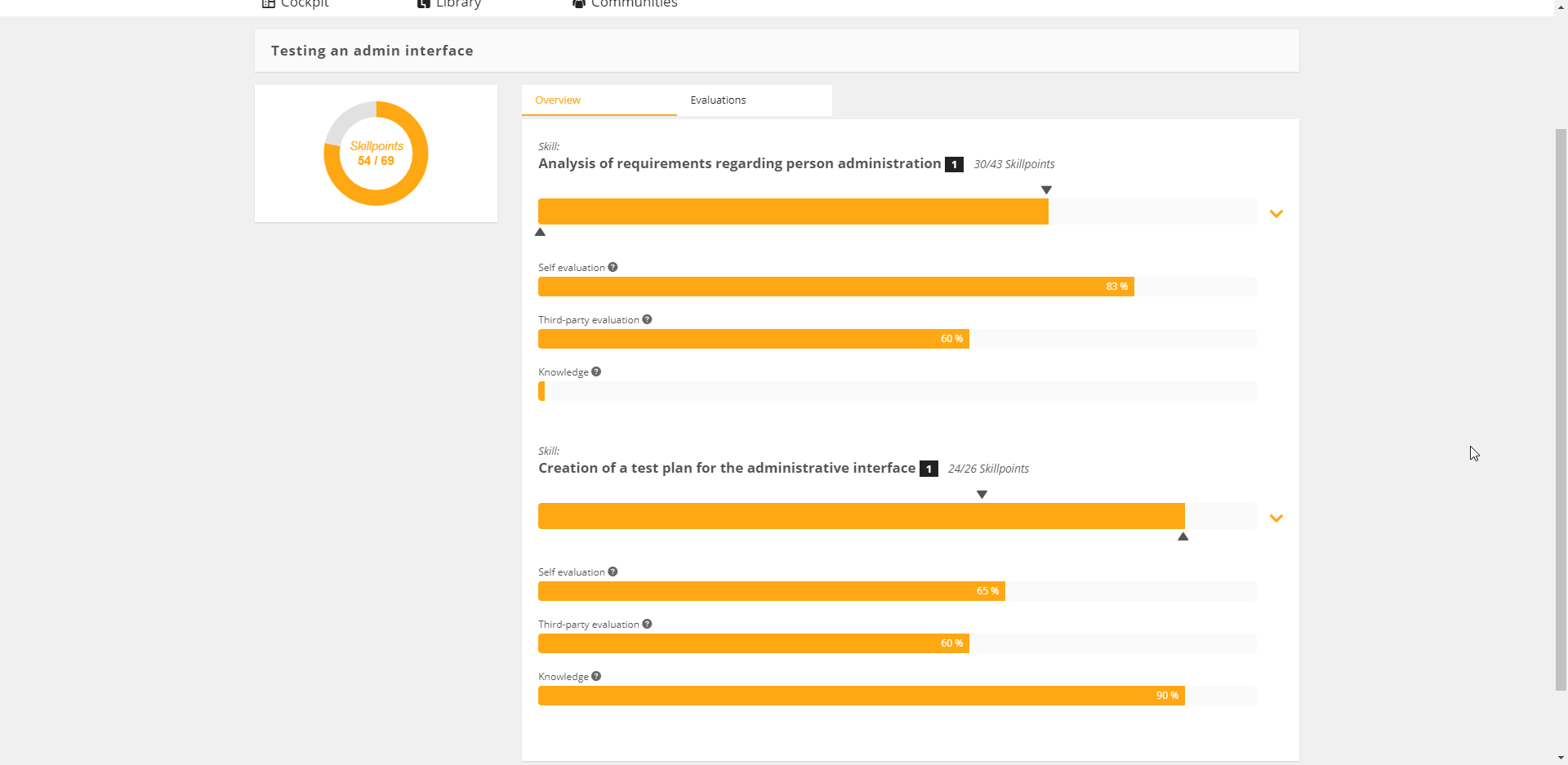 In diesem Fall liegen nur die Selbst- und Fremdbewertung vor – die Wissensbewertung fehlt oder ist niedriger. Daher wird der Durchschnitt dieser beiden Bewertungen als Fortschritt für den Skill verwendet.
