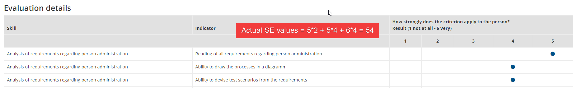 Die Regel lautet: Immer wenn die Wissensbewertung (basierend auf abgeschlossenen Kursen, die den jeweiligen Skills zugeordnet sind) höher ist als der Durchschnitt der Selbst- und Fremdbewertung, wird ausschließlich die Wissensbewertung zur Berechnung der Skillpoints herangezogen.