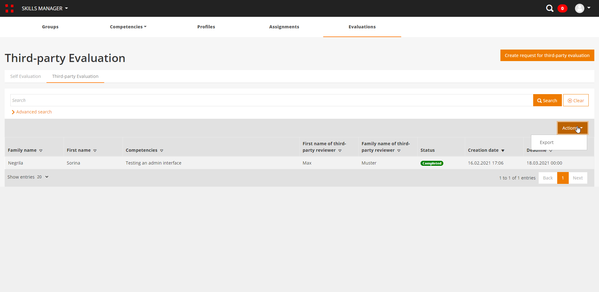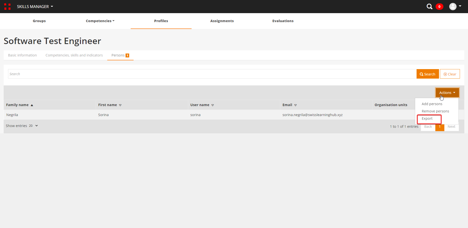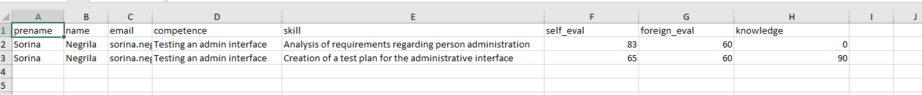 In einem spezifischen Jobprofil, unter dem Reiter Personen, kann der Administrator eine Excel-Datei für eine oder mehrere Personen als Zip-Datei exportieren. Diese enthält die Ergebnisse für die Selbsteinschätzung, die Fremdeinschätzung und die Kenntnisse. Jeder im Jobprofil aktivierte Skill erscheint in einer Zeile.