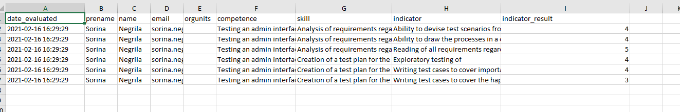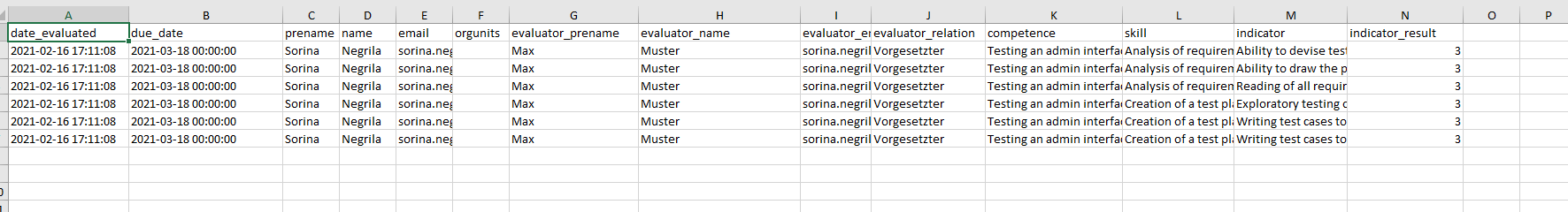 Der Export der Selbstbewertung ist ähnlich strukturiert, jeder aktivierte Indikator erscheint pro Zeile, enthält aber natürlich weniger Details, da die Fälligkeitsdaten und die Daten des Fremdbewerters fehlen. Hier ist ein Beispiel für den Export einer Selbsteinschätzung.