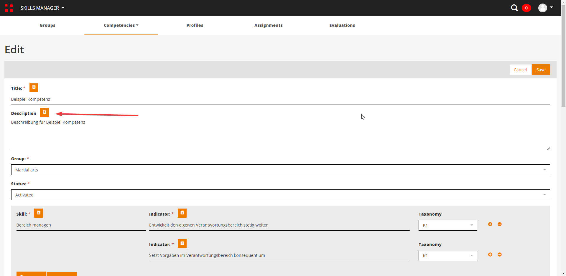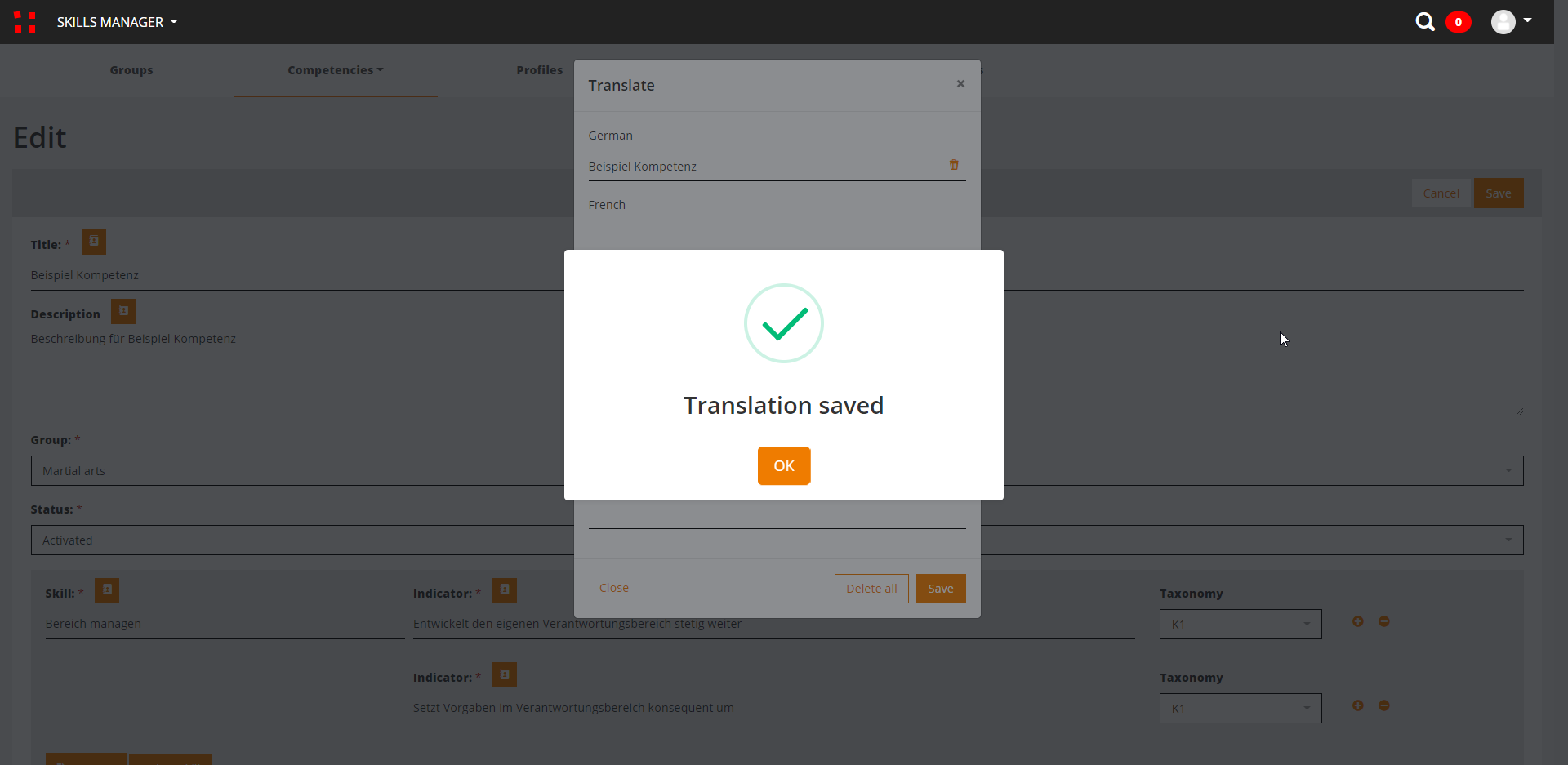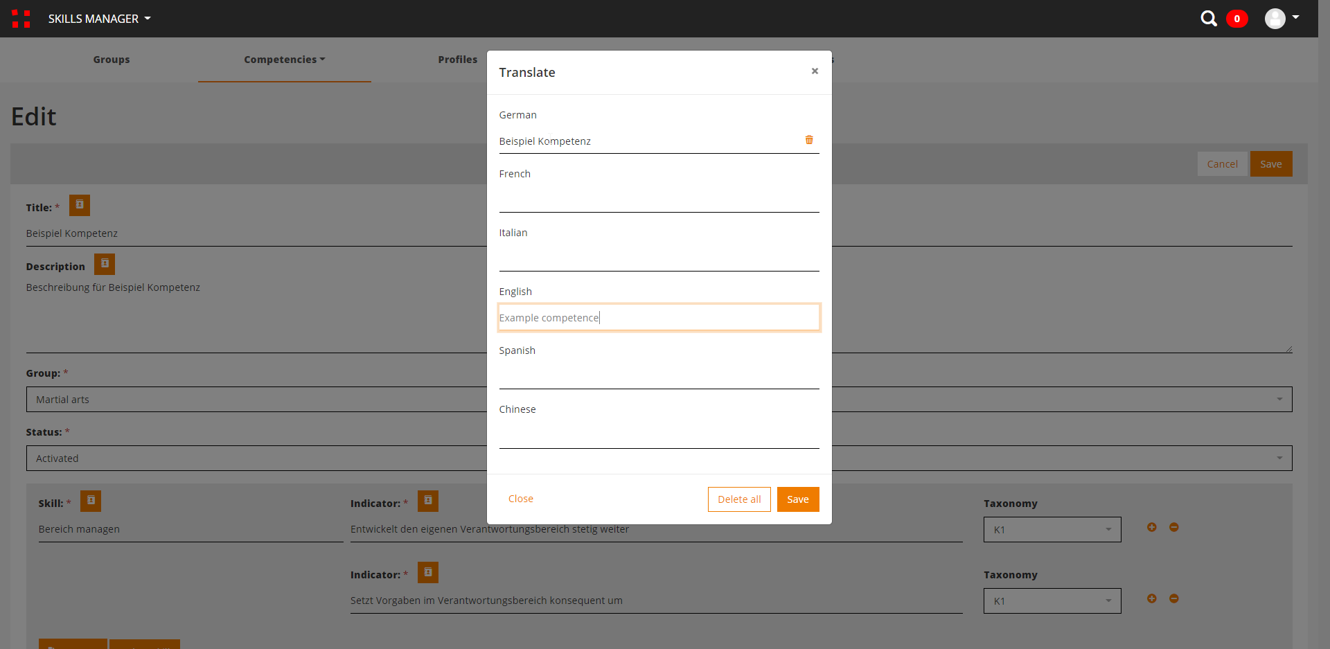 Übersetzungen können im Formular „Bearbeiten“ eines Objekts hinzugefügt werden. Wir werden dies anhand eines Formulars zur Bearbeitung einer Kompetenz veranschaulichen. Neben jeder Feldbezeichnung, die Übersetzungen unterstützt, finden Sie ein Wörterbuchsymbol. Wenn Sie darauf klicken, öffnet sich ein Fenster, in dem Sie die Übersetzungen hinzufügen können - für eine oder mehrere der unterstützten Sprachen. Klicken Sie auf Speichern und schließen Sie dann das Pop-up - alle Stellen, die Übersetzungen unterstützen (z. B. Profil-Widget, Bewertungsformulare usw.), verwenden nun die von Ihnen hinzugefügten Übersetzungen.