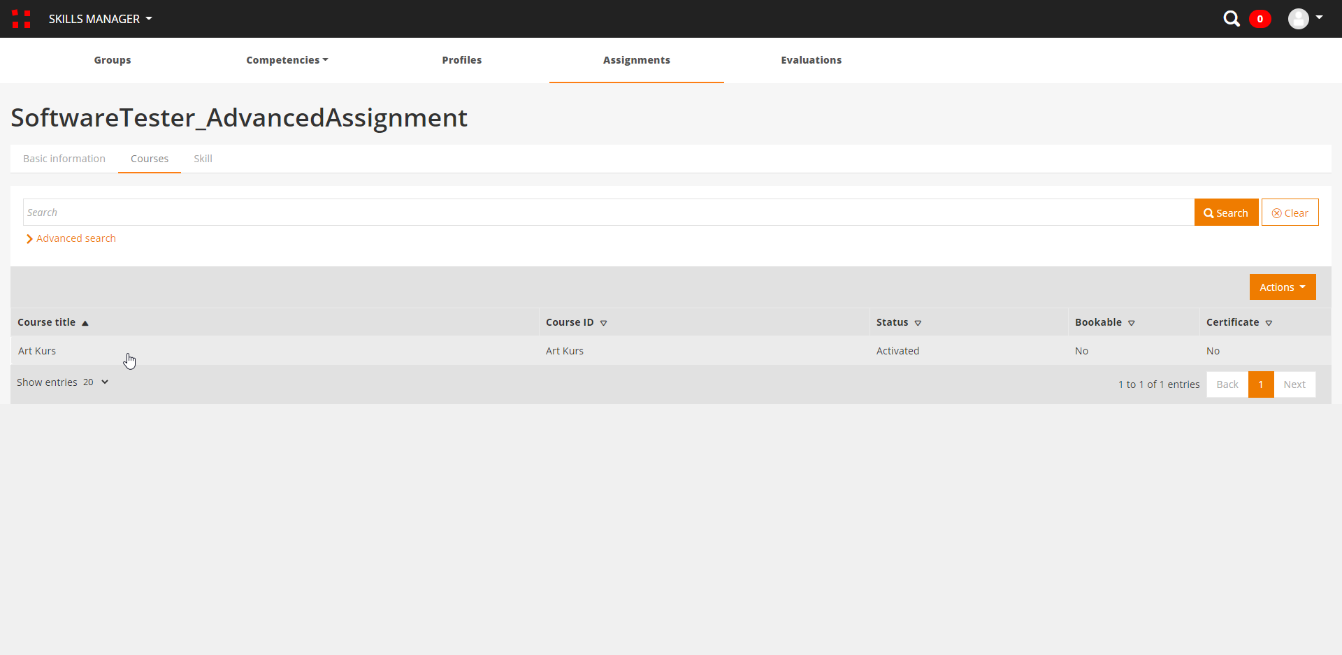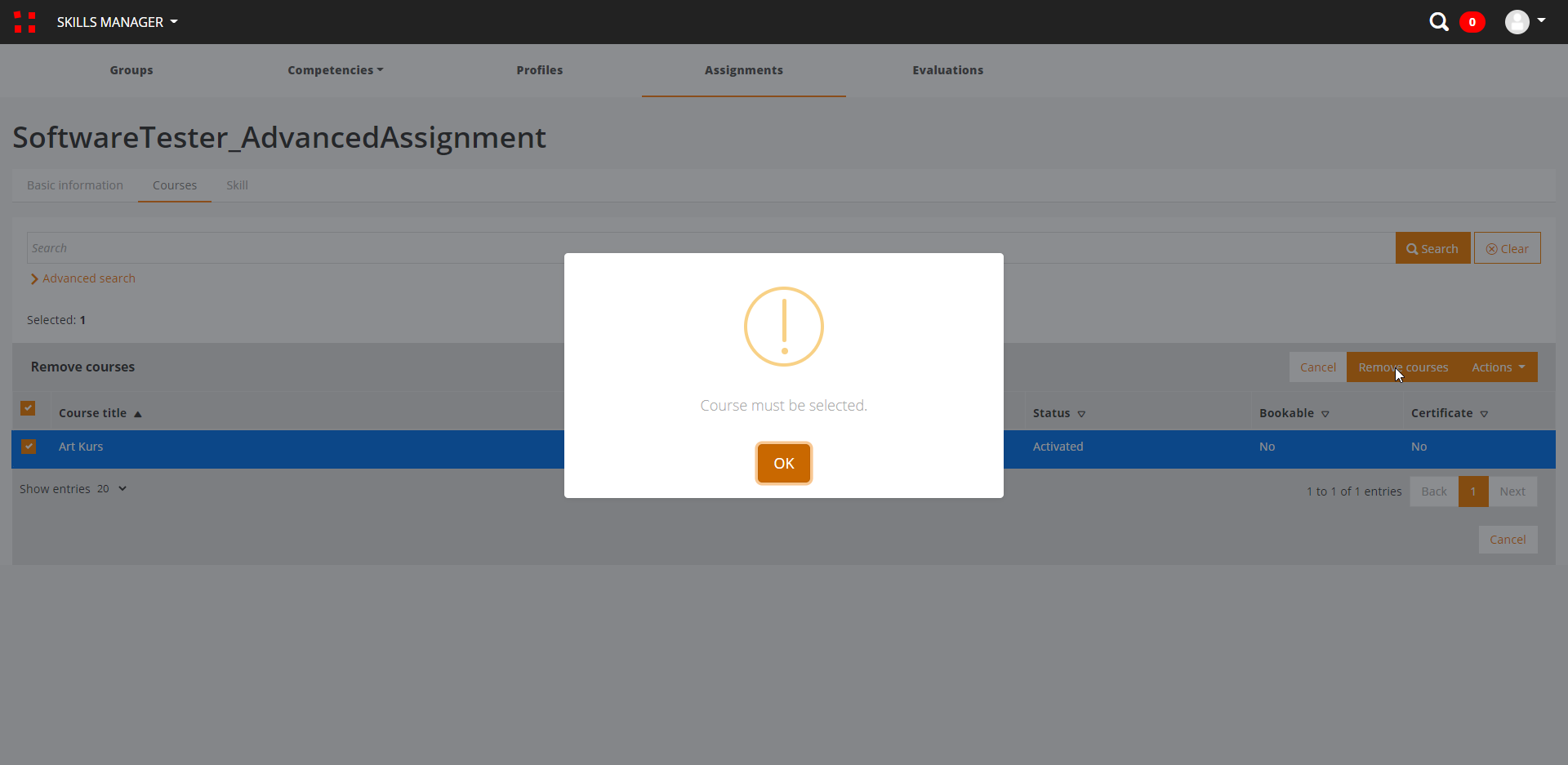 Denken Sie daran, dass eine Zuordnung mindestens 1 Kurs benötigt, um erstellt zu werden! Wenn Sie eine solche Zuordnung bearbeiten und versuchen, den einzigen vorhandenen Kurs zu löschen, werden Sie durch ein Informations-Pop-up daran gehindert. Sie können einfach einen weiteren Kurs hinzufügen, wenn Sie den aktuellen Kurs wirklich entfernen müssen.