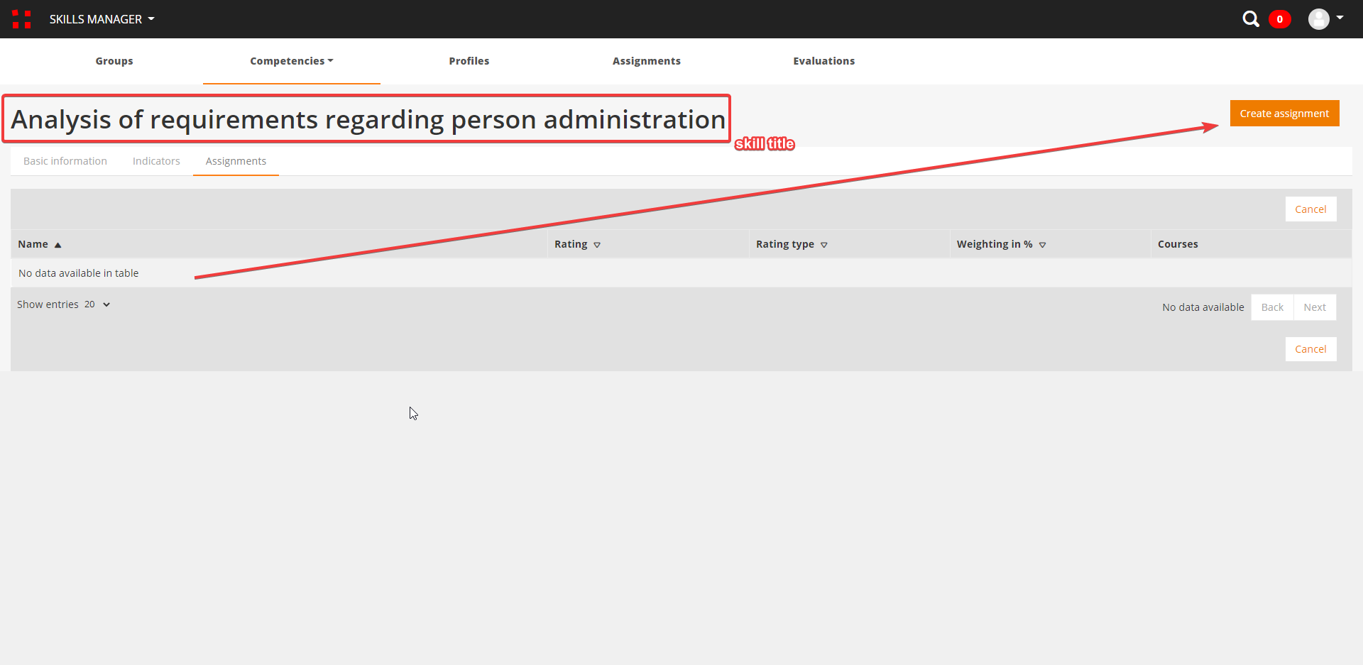 Bearbeitung von Kompetenzen / Skills/ Indikatoren, wenn diese bereits im Jobprofil aktiviert sind